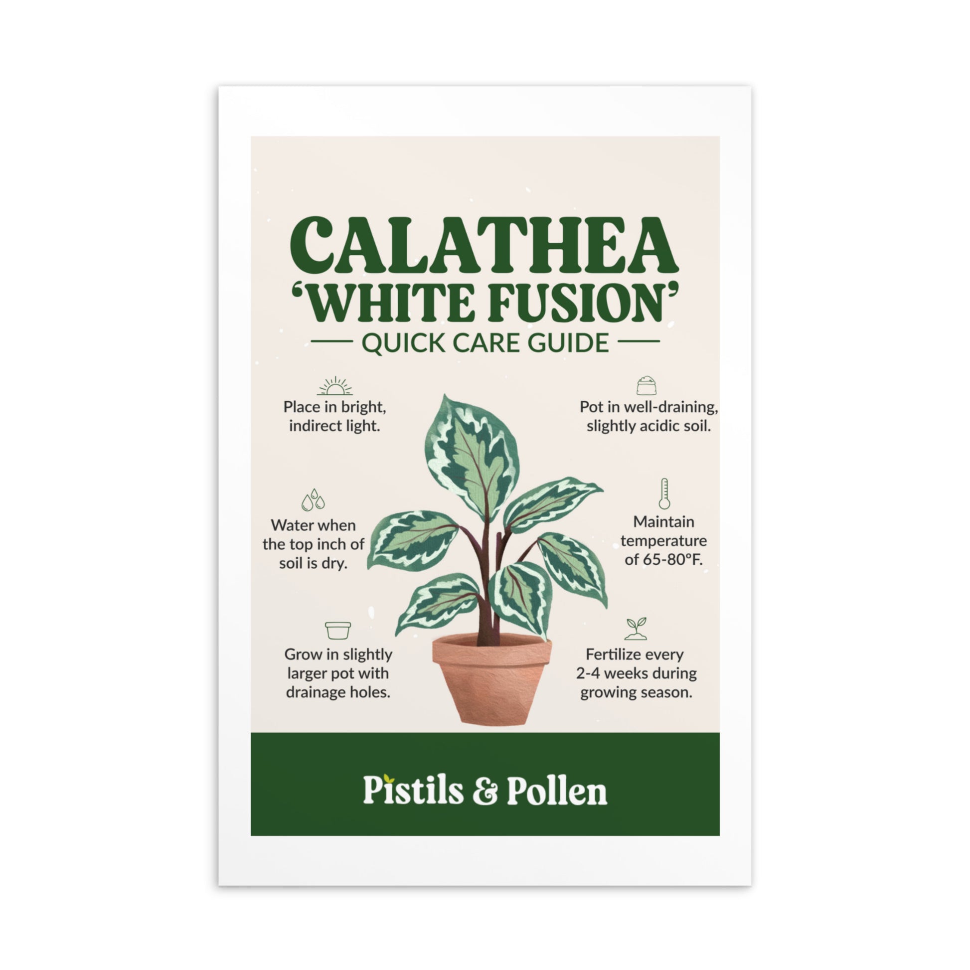 These Calathea 'White Fusion' quick care guide cards are made from thick, high-quality paper, so they serve as a great addition to a gift or just a thoughtful written note to a friend.